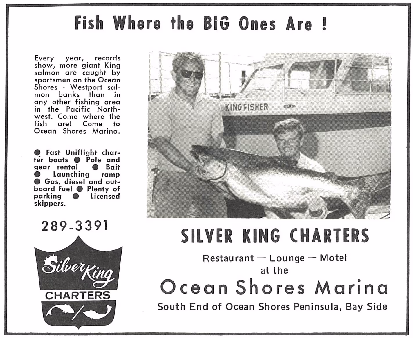Advertisements for Silver King Charters and Seahorse Pak Out from a 1970s Ocean Shores guidebook. 2022.03.14
